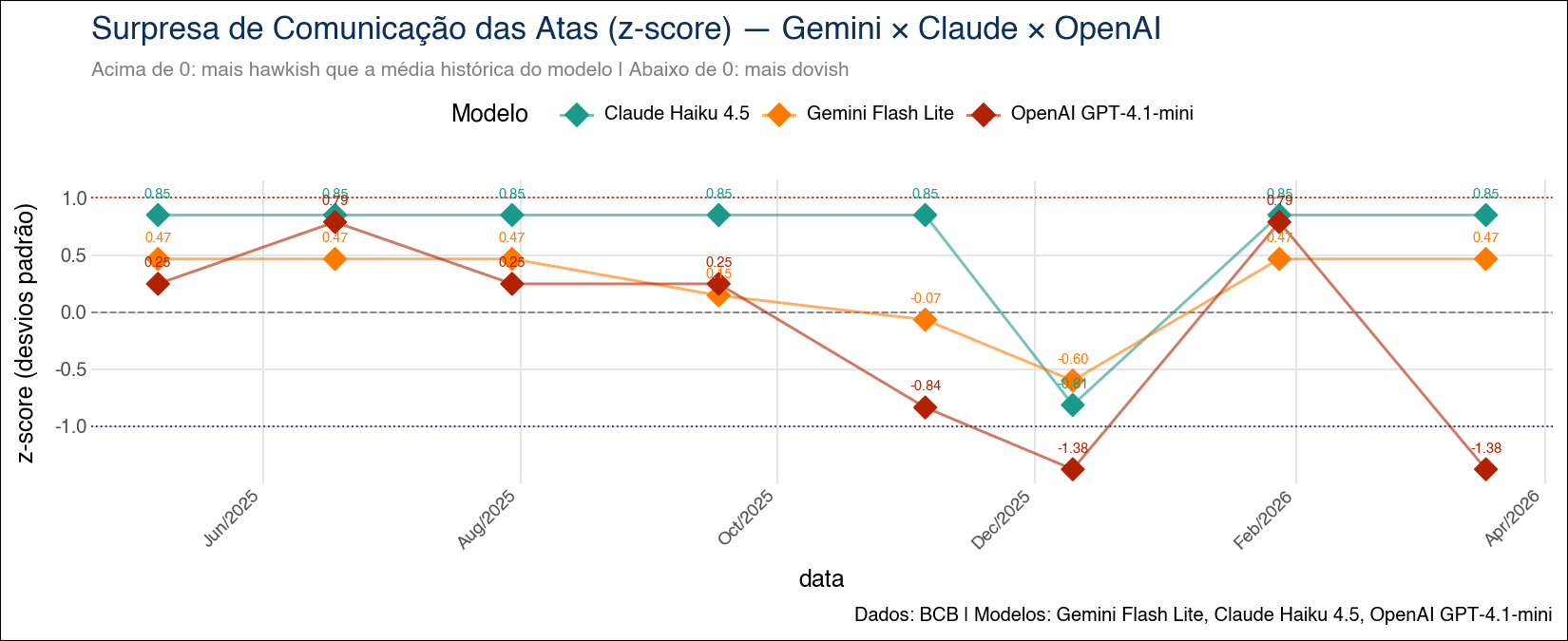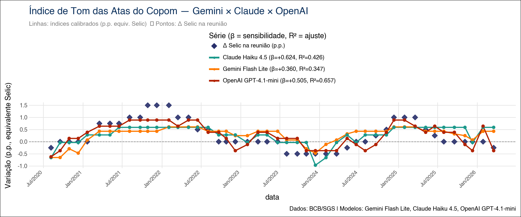 Os três modelos concordam sobre a direção do tom — qual ata é mais hawkish (sinaliza juros mais altos) ou dovish (sinaliza juros mais baixos) — mas divergem sobre a intensidade com que essa direção se traduz em variação da Selic. A sensibilidade calibrada \(\hat{\beta}\) varia de \(+0{,}36\) a \(+0{,}62\) p.p. por unidade de score, uma diferença de mais de 70%.